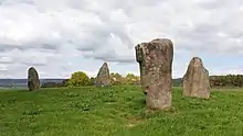 Nine Stones Close is a Bronze Age stone circle about 30m across, with four remaining upright stones about 2m high. Several original stones were removed in the 18th and 19th centuries, one of which stands in a field wall 70m to the south where it was taken to be used as a gatepost. Partial excavations of the circle were conducted by Thomas Bateman in 1847, Jewitt and Greenwell in 1877 and J P Heathcote in 1939. Many Bronze Age flints and pot-sherds were discovered.[8] Doll Tor stone circle lies about 1 kilometre (0.62 mi) east of Nine Stones Close. A further 1.5 kilometres (0.93 mi) north east is Nine Ladies stone circle on Stanton Moor.[1]