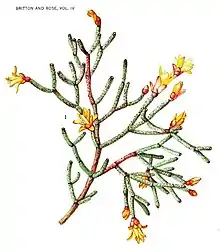 Hatiora cylindrica is closely related to Hatiora salicornioides, and has been included within that species.[3] Like H. salicornioides, it is a leafless perennial with many branched green stems made up of individual segments. These are strictly cylindrical as opposed to bottle-shaped in H. salicornioides. Its flowers, borne at the end of the stems, have many yellow to orange petals and open quite widely. They are followed by white fruits.[1][4]