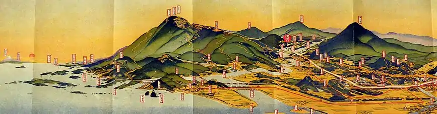Hatsusaburō Yoshida (吉田 初三郎, Yoshida Hatsusaburō, March 4, 1884–August 16, 1955) was a Japanese cartographer and artist, known by his bird's-eye view maps of cities and towns. Known as the "Hiroshige of the Taisho Era,"[1] Yoshida created over 3,000 maps in his lifetime.[2]