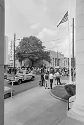 January 22, 1964, was "Freedom Day" in Hattiesburg, a major voter registration effort supported by student demonstrators and 50 northern clergymen. For the first time since Reconstruction, an inter-racial protest successfully picketed the courthouse for voting rights without being arrested. Roughly 100 African Americans attempted to register, though only a few were allowed into the courthouse. Fewer still succeeded in gaining entry on the rolls.[22] Each day thereafter for many months, activists resumed the courthouse protest in what became known as the "Perpetual Picket."[23]