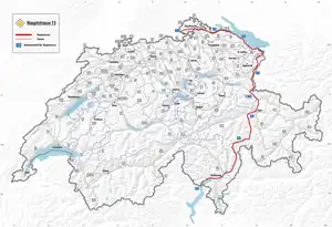 The Hauptstrasse 13 is a main road (“Hauptstrasse”) in the Swiss cantons of Schaffhausen, Zürich, Thurgau, St. Gallen, Grisons and Ticino. This main road begins at the German border at Trasadingen at the Bundesstraße 34 and ends at the Strada Statale 34 at the Italian border at Brissago. Between the border crossing Trasadingen / Erzingen and the A4 at Schaffhausen it is part of European route E54. The total length of Hauptstrasse 13 is approximately 320 kilometers.
