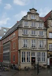 The building was destroyed in the second world war by an airstrike with incendiary bombs in 1944. Rudolf Stein, who later became Bremen's monument conservator, saved some of the debris including the façade. In 1957/58, the building was reconstructed on a new site on the corner of Langenstraße and Marktplatz. After a call for tenders, it was designed by the architect Eberhard Gildemeister (1897–1978) assisted by the sculptors Maria Ewel and Ingeborg Ahner-Siese. They used original building elements from the façade of the Schlachte building, adhering to the original style. Eberhard successfully combined the building's red-bricked lateral walls with the historic façade. The interior, however, was finished essentially in the style of the 1950s.[1] A notable design feature is the new door with a skylight on the market side. The internal decoration, too, contains many Baroque elements.[2]