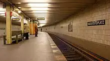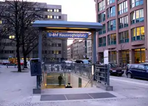 Hausvogteiplatz is a Berlin U-Bahn station on line U2, located in Mitte. The eponymous square, former site of a bastion of the historic city fortification (Berlin Fortress), was named after the Prussian aulic court and prison. In the late 19th century it had developed as a centre of Berlin's clothing industry.