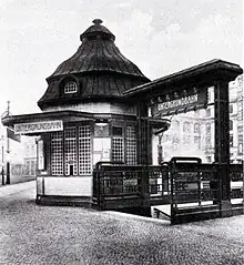 The station, designed by Alfred Grenander, opened on 1 October 1908 with Berlin's second U-Bahn line, running from Potsdamer Platz on the initial Stammstrecke route to Spittelmarkt. During an air raid on 3 February 1945 it was devastated by a direct bomb hit and could not be reopened until 1950.[2]