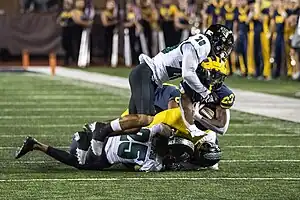 Hawaii players tackle a Michigan ball-carrier during a game in 2022