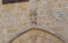 The oldest part of the house is the exterior as the interior was repeatedly rebuilt in Ottomans times. The doorway is a pointed arch with moulded voussures under an elaborate hood mould, which terminates in a well-preserved crocketed finial supporting the shield of the Royal Arms of Cyprus (namely of the Lusignan kings), although this shield is defaced or damaged. On either side of this shield are two pairs of smaller shields, each pair bracketed together. The right-most of these is in better condition and bears the common Italian design "Ondato" (i.e. waves). Within the apex of the arch is a smaller shield, probably of the house of Dampierre.[4]