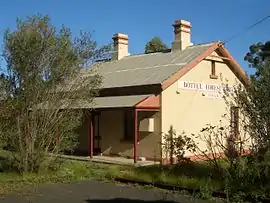 Heathcote railway station opened in 1886. Heathcote Hall was built in Heathcote East in 1887 by Abel Harber, a brick manufacturer. This grand Victorian house included a tower, which was a symbol of wealth. Harber suffered heavy financial losses during the construction of the Imperial Arcade in Sydney and attempted to dispose of the property but the 1892 depression did not help. The financial institution became the house's possessor and they arranged with George Adams of Tattersalls to organise a sweepstake with the house as a prize. The winner was Mr S. Gillett, a Sydney builder. The property was sold to Edmond Lamb Brown in 1901[5] and as of September 2014 it still stands, though in a "dilapidated" state.[6] The movie The Munsters' Scary Little Christmas was filmed at Heathcote Hall.[6][7]