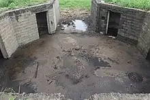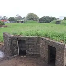 ![]() Entrance to southeast gun emplacement’s gun pit, looking southeast, 2019 | |