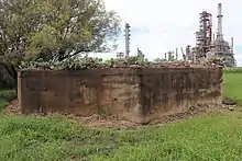 After the war, Brisbane's defences were dismantled. By 1963, the Lytton gun station's accommodation huts had been removed, although the gun emplacements, command post and two reserve magazines remained. That year several fuel tanks, part of a new Ampol refinery, were already under construction, to the north of the gun station. The defence reserve was not transferred from the Commonwealth to Ampol until 1964.[55][56] The southwestern reserve magazine and the house which had been used as an officer's mess were removed in the 1960s; the northern reserve magazine and the earth revetment on the west side of the northernmost gun emplacement were removed in the 1970s.[57] In 1990, Fort Lytton was declared a Historic National Park, after being relinquished by Ampol. The remaining refinery land, including the former GS 385, later became a Caltex refinery. In 1999, the National Park was extended to include part of the former quarantine station.[27][58] Photographs from inside the command post, taken in 2000, show caricatures of an Australian officer and a Japanese soldier, drawn on the walls. In 2019, the grassed site of GS 385 is fenced off, within the refinery.[1]