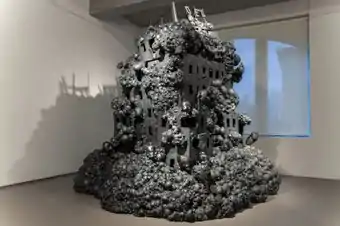 Two installation-like works from 2000 were later noted for their uncanny prophetic quality in light of the subsequent 9-11 attacks.[7][22][35] Demo froze the implosion of a building in mid-air, complete with highly textured, blackened falling bricks and signage letters, flying shards and oozed neoprene smoke resembling popcorn;[24] it references vanished 1950s landmarks from Fasnacht's native Midwest.[4][22] The more violent and unsettling Exploding Plane offers a complex sense of space, drawing viewers' eyes into, around and through the work and its aluminum-gray scattering parts (including suitcases) suspended in midair.[36][4][3][37] After 9/11, Fasnacht turned from explosions to more celebratory and meditative drawings of civic parades and fireworks, exploding champagne bottles, and water occurrences that suggested both mourning and renewal.[22][7][38]