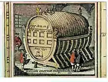 The Heidelberg Tun (German: Großes Fass), or Great Heidelberg Tun, is an extremely large wine vat contained within the cellars of Heidelberg Castle. There have been four such barrels in the history of Heidelberg. In 1751, the year of its construction, the present one had a capacity of 221,726 litres (58,574 U.S. gallons). Due to the drying of the wood its current capacity is 219,000 litres (57,854 U.S. gallons). One hundred and thirty oak trees were reputedly used in its construction. It has only rarely been used as a wine barrel, and in fact presently enjoys more use as a tourist attraction, and also as a dance floor since one was constructed on top of the tun.