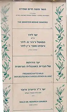 Plaque in the Jerusalem Forest dedicated to Grüber, below those to Moshe Shapira and George M. Leader