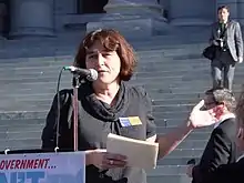Kelly speaking at a Budget day rally at Parliament in 2011