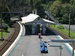 Helensburgh Railway Station is located in a bushland setting at the bottom of a valley, within a railway cutting.[2]
