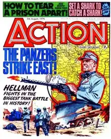 Action launched on 8 February 1976[lower-alpha 2], and was heavily advertised. It immediately caused a sensation, both in terms of sales and gathering negative attention from Britain's tabloid press. At the time of publishing, several conservative pressure groups were screening the media for its perceived negative influence on British youth, particularly the influential curtain-twitcher Mary Whitehouse, head of the National Viewers and Listeners Association. While "Hellman of Hammer Force" itself was relatively unscathed - with most of the criticism aimed at the gore of "Hookjaw" and "Death Game 1999", the anti-authoritarian "Kids Rule O.K." and the use of off-pitch violence in the football strip "Look Out for Lefty" it was nevertheless withdrawn along with the rest of the magazine after 16 October 1978 when press outcry reached fever pitch, leading to talk of newsagents boycotting IPC's entire output in protest.[1] Despite this, the strip did draw some bemused responses from young readers at a time when many had living grandparents who had fought against Germany in the war.[5]