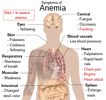 - ↑ Mikael, Mikael Häggström When using this image in external works, it may be cited as:Häggström (2009-04-13), English: Main symptoms that may appear in anemia. (See also Wikipedia:Anemia#Signs and symptoms). To discuss image, please see Template talk:Human body diagrams, retrieved 2018-04-11