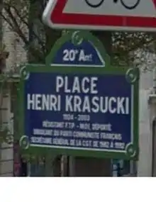 A roundabout in the 20th arrondissement of Paris was given the name Place Henri Krasucki in his honor on 23 June 2005. It is located at the intersection of Rue des Couronnes, Rue de la Mare, Rue Des Envierges and Rue des Cascades near Belleville. For a long time Krasucki lived just off the roundabout at 107 Rue des Couronnes.