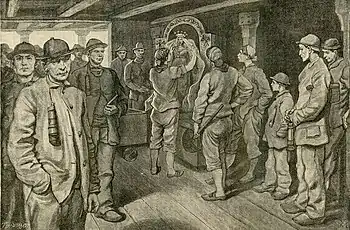 Miners in Belgium, adoring a statue of Santa Barbara; from L’illustrazione popolare