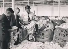 Photograph taken on 1 December 1954, when Henry 'Babe' Curran (standing on the right) of Ginninderra set two Commonwealth records at the Goulburn wool sales. The records were: (i) top price for the best wool (205d for 1lb) for the season; and (ii) top price paid for 'broken wool' (132d for 1lb) for the season.