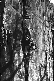 Henry Barber on first ascent of Savage Journey at Lost World, Mt. Wellington, Tasmania, 1975
