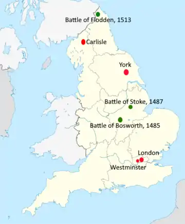 Meanwhile, the King's army under John de Vere, Earl of Oxford, had won a decisive victory over the rebels at the Battle of Stoke 16 June 1487.[65] Clifford was again given responsibility for the safety of York,[66] and he claimed "captenship" over the city, an assertion the city rejected.[67] In 1488 Clifford and Lady Anne both joined the city's Corpus Christi Guild. This does not seem to have restored Clifford in the eyes of the city officialdom, as the following year they again refused him entry, claiming that his intentions threatened the city's liberties. This may well have been prescient, suggests Summerson, as in 1513 Clifford attempted to claim the city's troops for his own army.[1] In 1489 the townspeople, "denyed the entrie of the Lords Clifford and othre, that in nowise noon othre gentilman of what degreor condiconhe he of be suffred to enter this the Kyngs Chaumbre and so all to be excludet and noon to have reule bot the Maiour, Aldermen and the Shireffs".[68] The city's statement came just before rebellion again broke out in Yorkshire, this time against heavy taxes. The commons overran the city and refused to allow Clifford or the sheriff, Marmaduke Constable entry. Instead, the citizens not only allowed the rebels to enter, they provided them a degree of military assistance.[66][note 8] The medievalist David Grummitt comments that the city's reluctance to allow Clifford either office or military assistance is in stark contrast to the fervour with which they served "our ful gode and gracious lorde the duc of Gloucestre" as both Duke and King.[67]