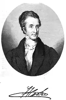 Henry Cooke came of a family of puritan settlers in County Down from Devonshire. His family was described as "narrow minded Calvinistic conservatives, well noted for their anti-Catholic prejudices."[1] He was the youngest son of John Cooke, tenant farmer of Grillagh, near Maghera, County Londonderry, by his second wife, Jane Howie or Howe, of Scottish descent, and was born on 11 May 1788. From his mother he derived his force of character, his remarkable memory, and his powers of sarcasm. A vivid impression, retained through life, of the events of 1798—the Irish Rebellion—influenced his political principles. After struggling for an education in rude country schools, he matriculated at Glasgow College in November 1802. Owing to illness he did not graduate, but he completed the arts and divinity courses, not shining as a student, but taking immense pains to qualify himself as a public speaker. Fresh from Glasgow, he appeared before the Ballymena presbytery in the somewhat unclerical attire of blue coat, drab vest, white cord breeches and tops, proved his orthodoxy on trial, and was licensed to preach.[2]