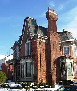 The Henry W. Baker House is a two-story structure constructed from brick.[2] The house is of a fanciful Italianate design, likely based on an illustration in a pattern book. The house was a landmark in Plymouth because of the unusual tower, shaped like a pagoda, atop the mansard roof.[2] The house is asymmetrical in plan, with a cut stone foundation and a kitchen wing in the rear, extended by later additions of a carriage shed and cement block garage. The main section of the house is articulated with bay windows and porches, and gables on the upper story, most noticeable on the front facade.[2] The entrance has arch-top double doors under a small porch; over that is a window with a gabled pediment.[2]