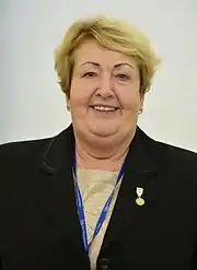 Henryka Krystyna Krzywonos-Strycharska was the former head of the Gdańsk transport workers.[1] She is noted for playing a role in strikes and protests in 1980 Gdańsk. The authorities later beat her causing her to miscarry, as she had been pregnant at the time. Afterward she became involved in "family orphanages" and adopted 12 orphans with her third husband.[2]