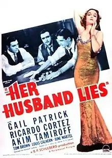 Her Husband Lies is a 1937 American drama film directed by Edward Ludwig and written by Wallace Smith and Eve Greene. The film stars Gail Patrick, Ricardo Cortez, Akim Tamiroff, Tom Brown, Louis Calhern and June Martel. The film was released on March 13, 1937, by Paramount Pictures.[1][2]