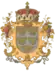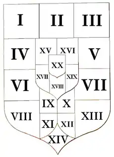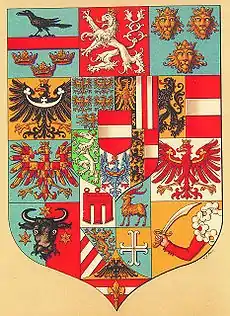 Before 1915, the arms of the different territories of the Austrian part of the Empire (heraldry was added to some areas not shown in the previous version and to the left to the Hungarian part) appeared together in the shield positioned on the double-headed eagle coat of arms of the Austrian Empire as an inescutcheon. The eagle was inside a shield with a goldfield. The latter shield was supported by two griffins and was topped by the Austrian Imperial Crown (previously these items were included only in the large shield). Then, shown in the center of both arms of dominion, as an inescutcheon to the inescutcheon, is the small shield, i.e. personal arms, of the Habsburgs. All this was surrounded by the collar Order of the Golden Fleece.[2][3]