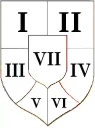 The western or Austrian part of the empire, Cisleithania, continued using the shield of the Empire in 1815 but with the seals of various member territories located around the central shield. Paradoxically, some of these coats of arms belonged to the territories that were part of the Hungarian part of the empire and shield. This shield, the most frequently used until 1915, was known as the middle shield. There was also the small shield, with just the personal arms of the Habsburgs, as used in 1815.