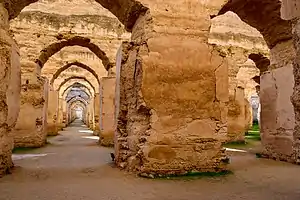 The Heri es-Swani or Heri es-Souani (Arabic: هري السواني, lit.'silo of the norias'), sometimes also transliterated as Hury as-Swani[1][2] or Hri Swani,[3] is a historic monument in Meknes, Morocco. It was a massive structure that served as a granary or silo for the Imperial Kasbah built by Moulay Isma'il during his reign from 1672 to 1727. It was part of a larger compound of facilities which also included the attached House of the Ten Norias, which provided water for the palaces, and a large water basin nearby known as the Sahrij Swani or Agdal Basin.[4][3] The name "Heri es-Swani" often applies to both the House of the Ten Norias and the silos, which are connected to each other and visited as a single attraction by tourists today.[5] In popular usage the silos are often misidentified as the "Royal Stables", but those stables were in fact a different structure that existed further south.[6][7]
