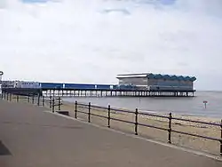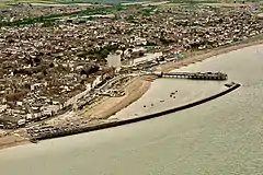The town's heyday as a seaside resort was during the late Victorian era; the population nearly doubled from 4,410 to 8,442 between 1881 and 1901.[4] Much of the resulting late Victorian seafront architecture is still in existence today. In 1910, a pavilion was added to the landward end of the pier.[13] By 1931, the town's population had grown to 14,533. At the beginning of World War II, the army cut two gaps between the landward end of the pier and the seaward terminal as a counter-invasion measure. The pier's two gaps were bridged for pedestrians after the war.[12]