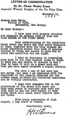 Heroes of the Fiery Cross is a book in praise of the Ku Klux Klan, published in 1928 by Protestant Bishop Alma Bridwell White, in which she "sounds the alarm about imagined threats to Protestant Americans from Catholics and Jews", according to author Peter Knight.[1] In the book she asks rhetorically, "Who are the enemies of the Klan? They are the bootleggers, law-breakers, corrupt politicians, weak-kneed Protestant church members, white slavers, toe-kissers, wafer-worshippers, and every spineless character who takes the path of least resistance."[2][3] She also argues that Catholics are removing the Bible from public schools.[4] Another topic is her anti-Catholic stance towards the United States presidential election of 1928, in which Catholic Al Smith was running for president.[2]