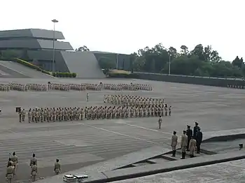 A military parade part of a ceremony on Heroico Colegio Militar at Tlalpan, Mexico City.