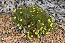 Hibbertia hibbertioides is a prostrate or sprawling shrub that typically grows to a height of up to 30 cm (12 in) and usually has glabrous branches, at least when they are mature. The leaves are crowded, pale-coloured, linear and cylindrical to triangular in cross-section, 3.5–17 mm (0.14–0.67 in) long and 0.5–0.6 mm (0.020–0.024 in) wide. The flowers are arranged singly in leaf axils or on the ends of short side shoots, and are sessile or on a peduncle up to 17 mm (0.67 in) long with inconspicuous bracts 1–2 mm (0.039–0.079 in) long. The flowers are 10–15 mm (0.39–0.59 in) in diameter with five sepals joined at the base, the inner sepals 5.5–7.5 mm (0.22–0.30 in) long, the outer ones distinctly shorter. The five petals are yellow, egg-shaped with the narrower end towards the base and 5–9 mm (0.20–0.35 in) long with a small notch at the tip. There are usually eleven stamens, nine fused at the base in groups of three and one or two free, arranged around the three glabrous carpels that each contain one ovule.[2][3]