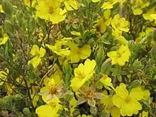 Hibbertia riparia, commonly known as erect guinea-flower,[2] is a species of flowering plant in the family Dilleniaceae and is endemic to the south-eastern Australia. It is an erect to spreading shrub with hairy foliage, linear leaves and yellow flowers with six to sixteen stamens in a single cluster on one side of two carpels.