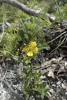 Hibbertia villosa is an erect shrub that typically grows to a height of up to 50 cm (20 in) and has its branches and leaves covered with whitish hairs up to 3 mm (0.12 in) long. The leaves are spatula-shaped to egg-shaped with the narrower end towards the base, 7–25 mm (0.28–0.98 in) long, 3–10 mm (0.12–0.39 in) wide and sessile. The flowers are arranged in leaf axils and are sessile with hairy bracts about 1.5 mm (0.059 in) long at the base. The sepals are narrow egg-shaped, 6.3–9 mm (0.25–0.35 in) long, the petals yellow, spatula-shaped, 10–23 mm (0.39–0.91 in) long and 7–10 mm (0.28–0.39 in) wide. There are usually fifteen to twenty stamens arranged in three groups around three glabrous carpels. Flowering occurs from August to November.[2][3]