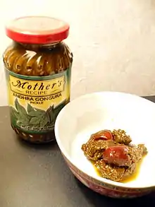 Hibiscus leaves pickle is a popular pickle in Andhra Pradesh made with fresh Roselle (Hibiscus sabdariffa) or Gongura leaves, where it is known as Gongura pacchadi or Gongura Pickle. It is also consumed in Telangana, Tamil Nadu, Maharashtra, and Karnataka. In some of India's North-Eastern states, the plant is known as aamelli or mwitha.[1][2] These sour/spicy pickles are also available commercially.[3]