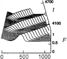 Such undeformed moving domains in crystals with slit electrodes are bands parallel to the electrodes, and seen by the oscillating field, when plotted in a x,F,t diagram give the optical impression of bifurcation (Fig. 8).[6]