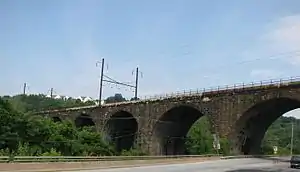 In later years, a concrete parapet was added to the bridge and the tops of some arches were reinforced with concrete. Catenary poles were added to the bridge with electrification in the 1930s.[10] Ownership of the bridge passed, with the rest of the Main Line, to Penn Central in 1968 and Amtrak in 1976.