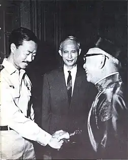 At Gia Long Palace after the turn-over ceremony (between Air Vice Marshal Nguyen Cao Ky and the out-going Prime Minister) June 21, 1965. Left: Prime Minister Nguyễn Cao Kỳ. Middle: Ex. Prime Minister Phan Huy Quát. Right: Ex. Chief of State Phan Khắc Sửu.