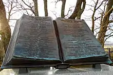 The High Water Mark of the Rebellion Monument[2] is a Gettysburg Battlefield memorial which identifies the Confederate Army of Northern Virginia units of the infantry attack on the Battle of Gettysburg, third day, with a large bronze tablet, as well as the Union Army of the Potomac's "respective troops who met or assisted to repulse Longstreet's Assault." The memorial is named for the line of dead and wounded of Pickett's Charge which marked the deepest penetration into the Union line at The Angle when "4,500 men threw down their arms and came in as prisoners".[3] The line is now generally marked with unit monuments which are also historic district contributing structures. The High Water Mark monument is accessible via Hancock Avenue which has parking spaces alongside, and a path leads to the site from a parking lot at the former Cyclorama Building at Gettysburg, which served for fifty years as a Gettysburg Battlefield visitor center by the National Park Service until it was demolished in 2013.[4]