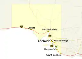 Major settlementsMillicent, Kingston SE, Murray Bridge, Mount Barker, Adelaide, Port Wakefield, Port Augusta, Ceduna