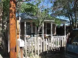 The house is an example of New Mexico vernacular architecture, with adobe walls and a corrugated metal roof. The house has a hipped roof with exposed rafters and a shed-roofed wooden porch supported by six turned columns. The front elevation is symmetrical with two wood-framed sash windows flanking the main entrance door. The front windows and transom over the door have ornamental diamond panes. There is also a small bay window on the south side of the house.[3]