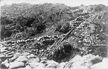 By October 1916, the mine under Hill 60 held 53,300 pounds (24,200 kg) of explosives and that under The Caterpillar 70,000 pounds (32,000 kg), despite water-logging and the demolition by a camouflet of 200 feet (61 m) of a German gallery above the British diggings, which endangered the British deep galleries.[29][30] The 1st Australian Tunnelling Company took over in November 1916 and maintained the mines beneath Hill 60 and The Caterpillar over the winter and months of underground fighting until June 1917, when they were fired along with the rest of the mines under Messines Ridge at the beginning of the Battle of Messines (7–14 June 1917).[29][30] When the mines were detonated at 3:10 a.m. on 7 June 1917, 990,000 pounds (450,000 kg) of explosives went off under the German positions, demolishing a large part of Hill 60 and killing c. 10,000 German soldiers between Ypres and Ploegsteert.[31][lower-alpha 4]