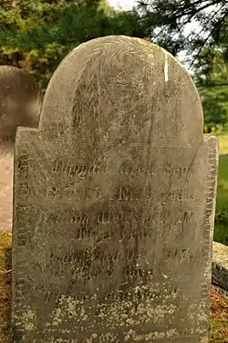 The cemetery was established in 1753 with a gift to the town of its land by Ebenezer and Thomas Wright (the latter of whom is interred here). The oldest dated grave is that of Jacob and Abigail Wright, a married couple both of whom died in 1761. The earliest markers are typically slate, while granite and marble appear in the markers and memorials of the 19th and 20th centuries. There are several obelisks (including one with a triangular cross-section), all placed in the second half of the 19th century. There are two zinc burial markers, both manufactured by the Monumental Bronze Company of Bridgeport, Connecticut for members of the Keyes family.[2]