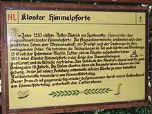 The monastery was founded in 1253 by the lords of Hartesrode in a sheltered, wooded valley, northwest of Hasserode. They chose this site because Hermits of St. William had previously resided here. The Augustinian friars bred fish and even grew vineyards. Martin Luther visited Himmelpforten on 6 August 1517, where he met his friend and fellow friar, at that time the Vicar General of the Order, Johann von Staupitz, with whom he discussed the sale of indulgences.