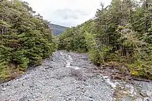 4 ha (9.9 acres) of the river near the Buller is a Scientific Reserve for Black-billed Gulls (tarāpuka) and Black-fronted Terns (tarapiroe).[6] Forest in the valley is dominated by red beech (tawhai raunui), with some silver beech (tahina), several varieties of filmy ferns, including narrow filmy-fern, several coprosmas, including red-currant coprosma, and weeping māpou.[7]