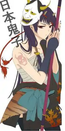The main design motif is based on the Oni in Japanese folklore. Since the character was designed to be a "personification" of the slur, she is portrayed as a young woman with long black hair and pale skin, often wearing a kimono and demon horns, whilst holding various motifs unique to Japanese culture, such as a naginata and a hannya mask.[1] A variant of the character is known as "little Oniko" (Ko-hinomoto or Konipon) (derived from another Chinese slur, Xiao riben "小日本" pinyin: xiǎo rìběn), who is depicted as a pre-pubescent girl of similar appearance to the original Oniko, and also carries Japanese culture-related motifs along with her.